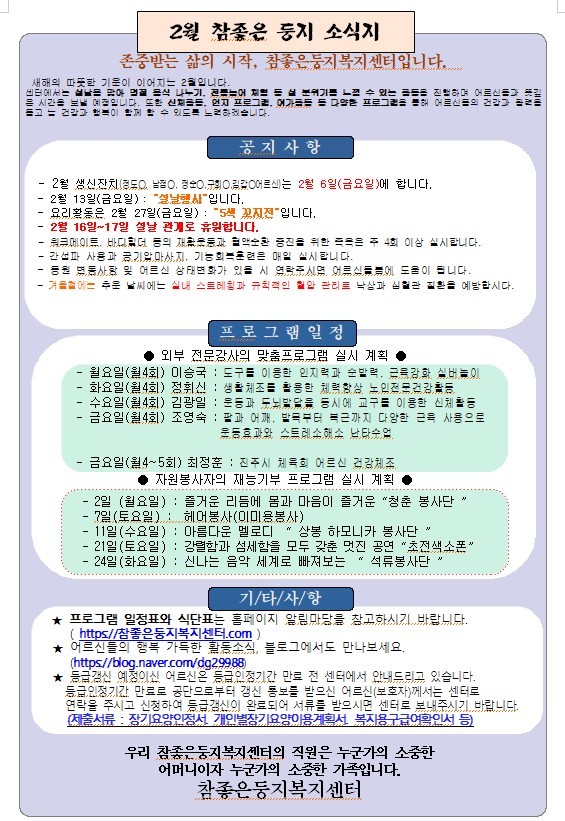 설날 명절행사와 다채로운 프로그램을 통해 어르신들께 즐거움을 드리고, 기능회복훈련에도 최선을 다하겠습니다. 감사합니다. |
